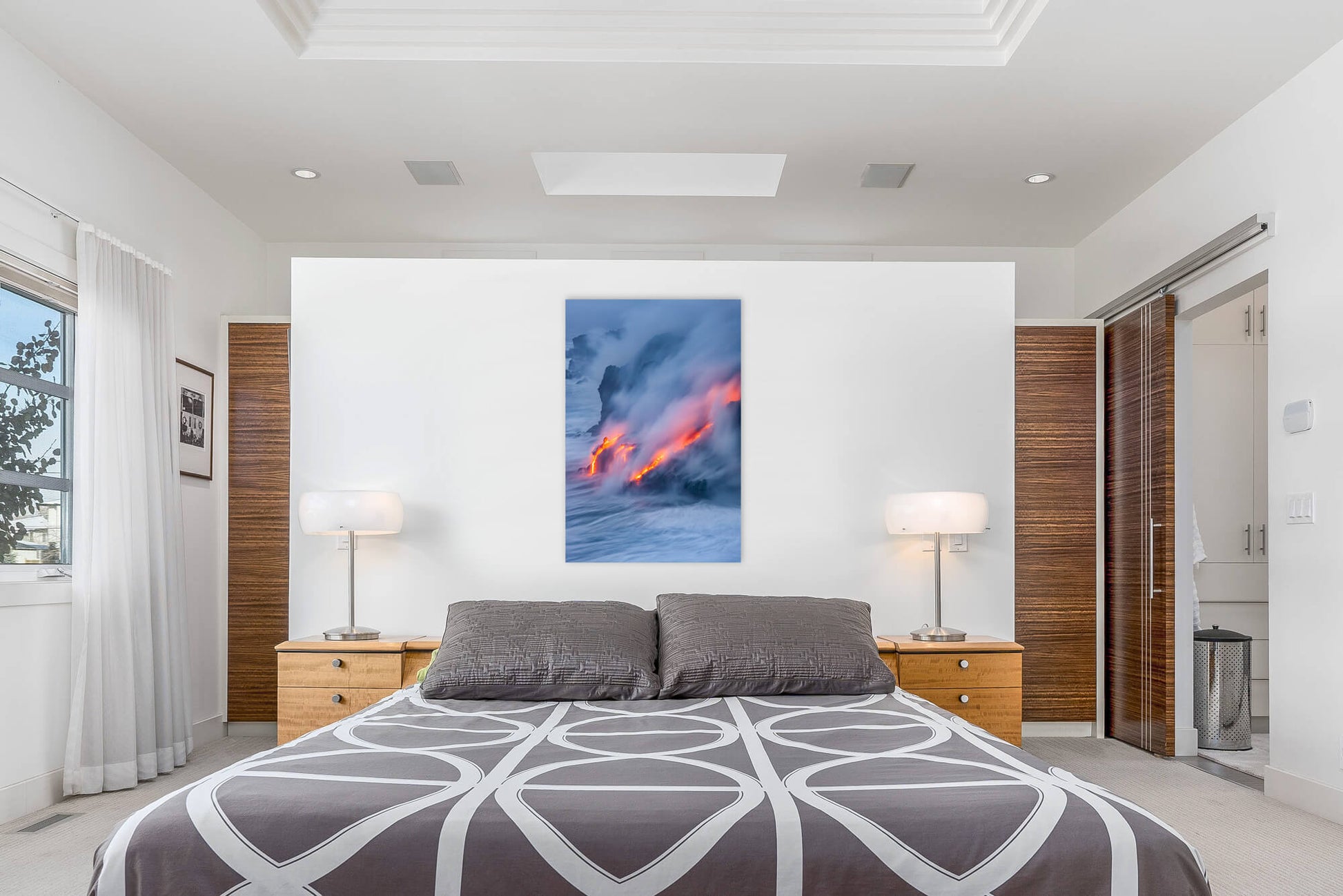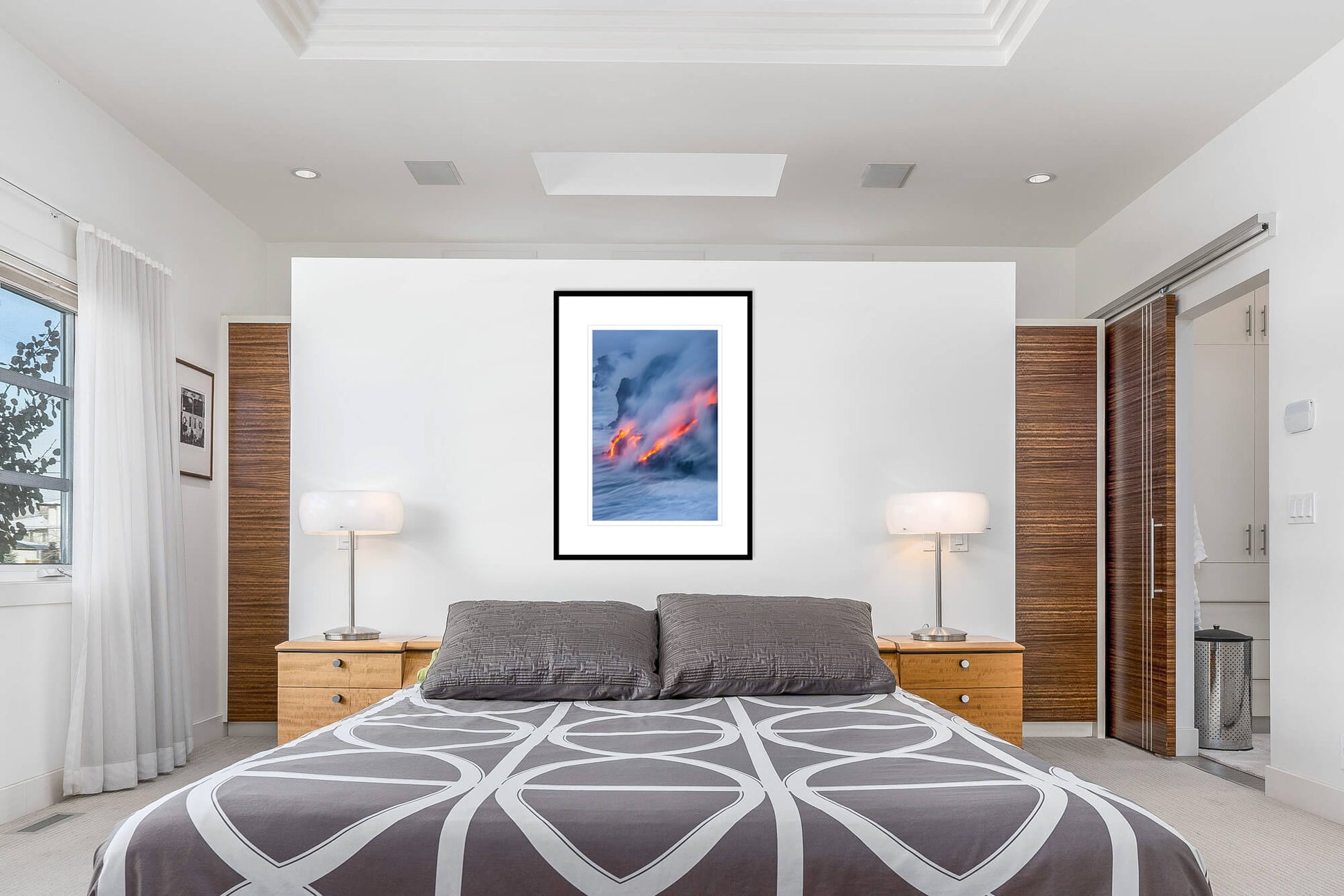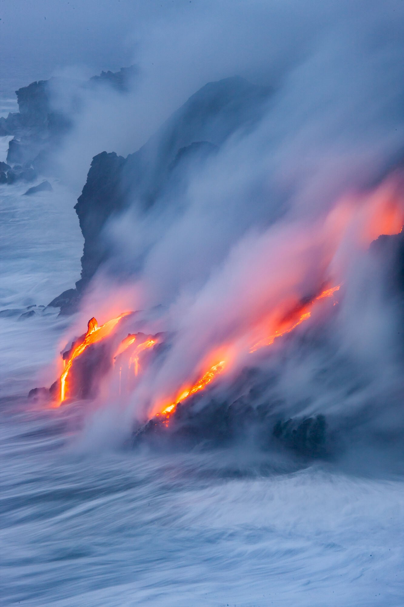 We faced heavy rain for 30 minutes when we arrived at the cliff overlooking the lava flow into the ocean. We hunkered down behind umbrellas and were rewarded by this incredible “blue” light when the weather began to break.