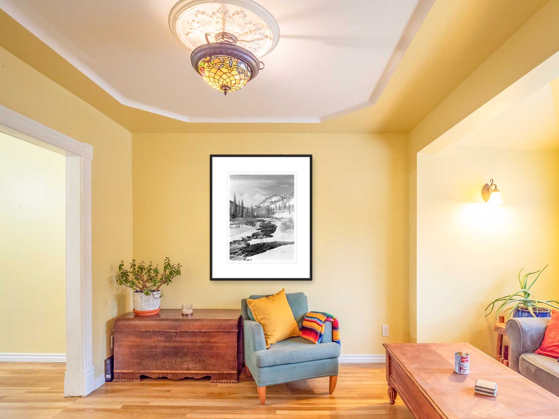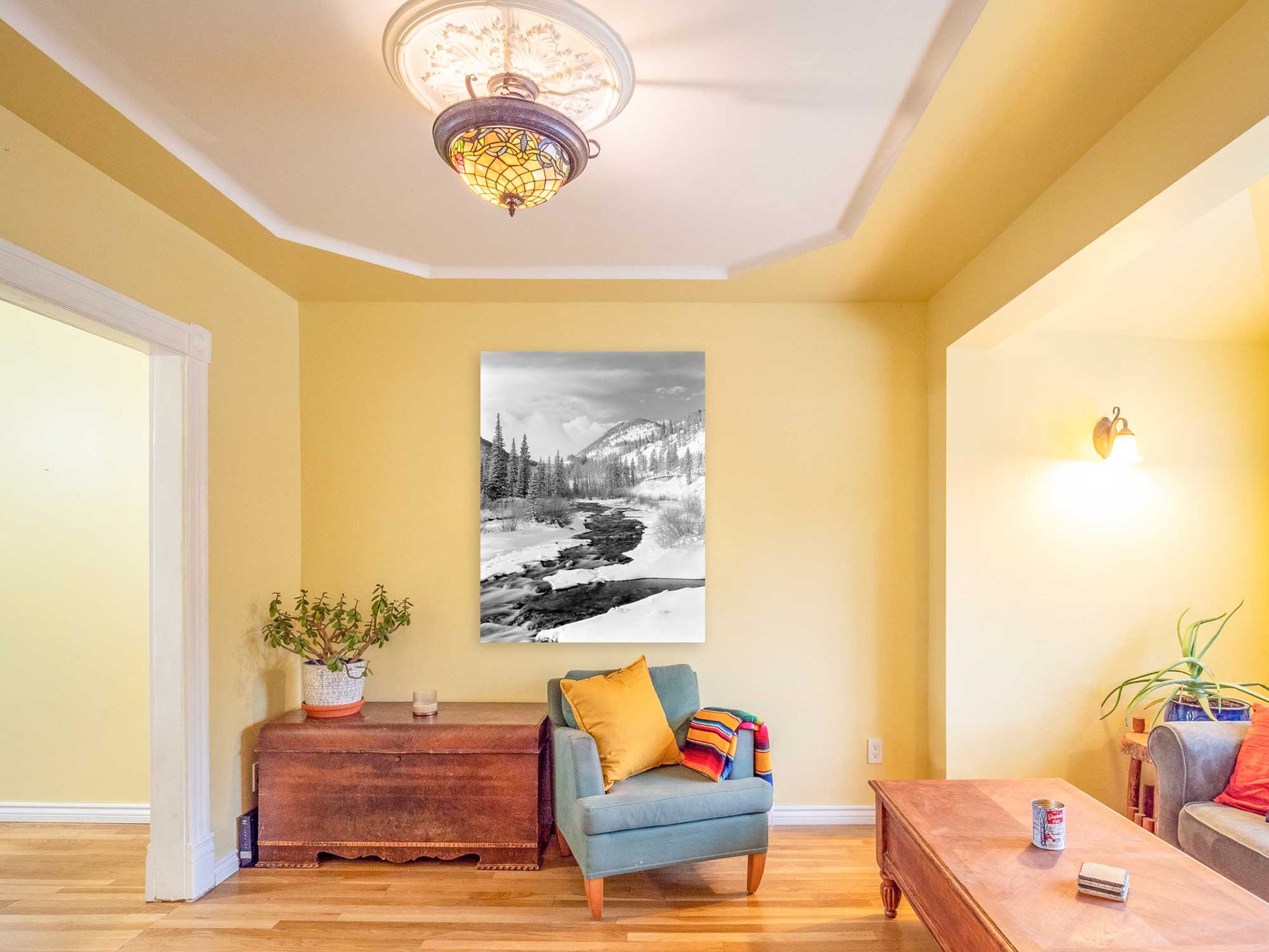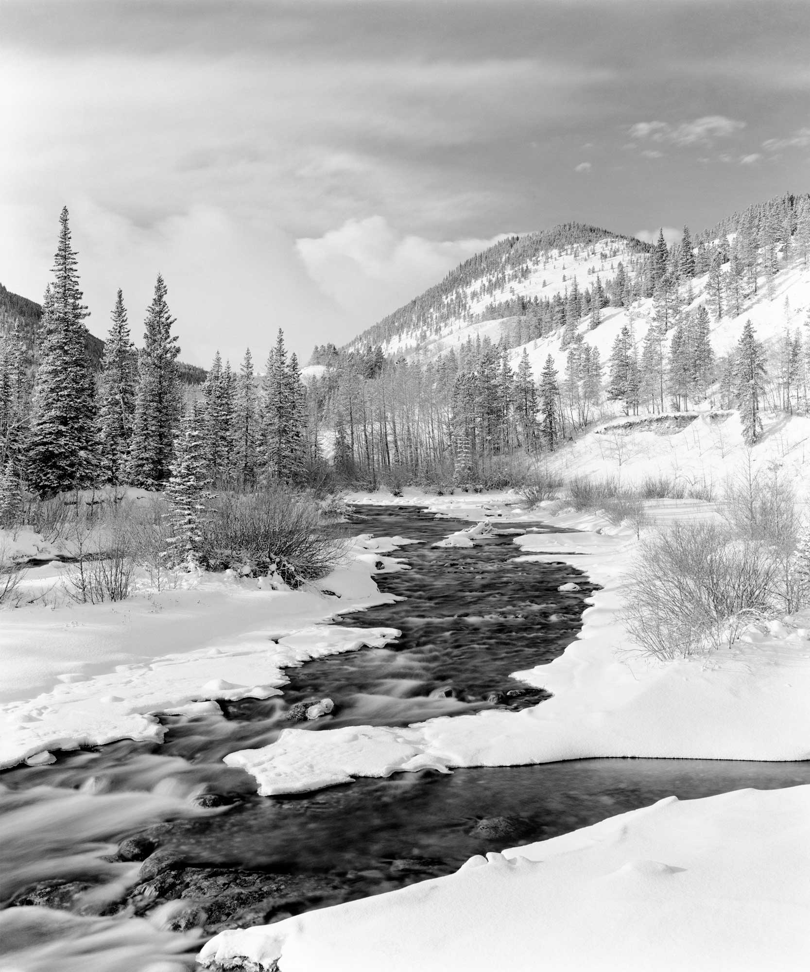 Captured in the early morning after a fresh snowfall, this image portrays a dynamic crispness as the Little Elbow River sweeps through the frame.
