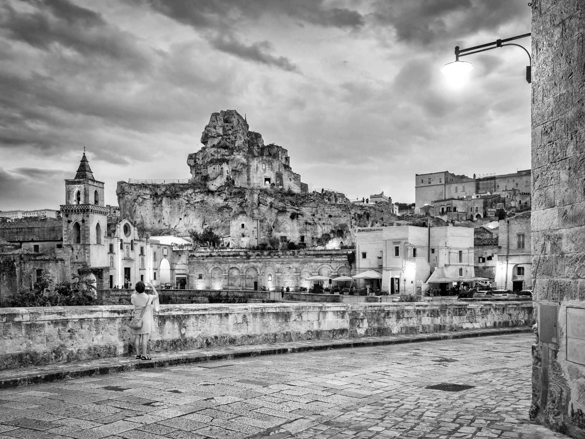 A woman looks south towards the Rupestrian Church in Sassi Caveoso in Matera. The church is carved directly into the rock.