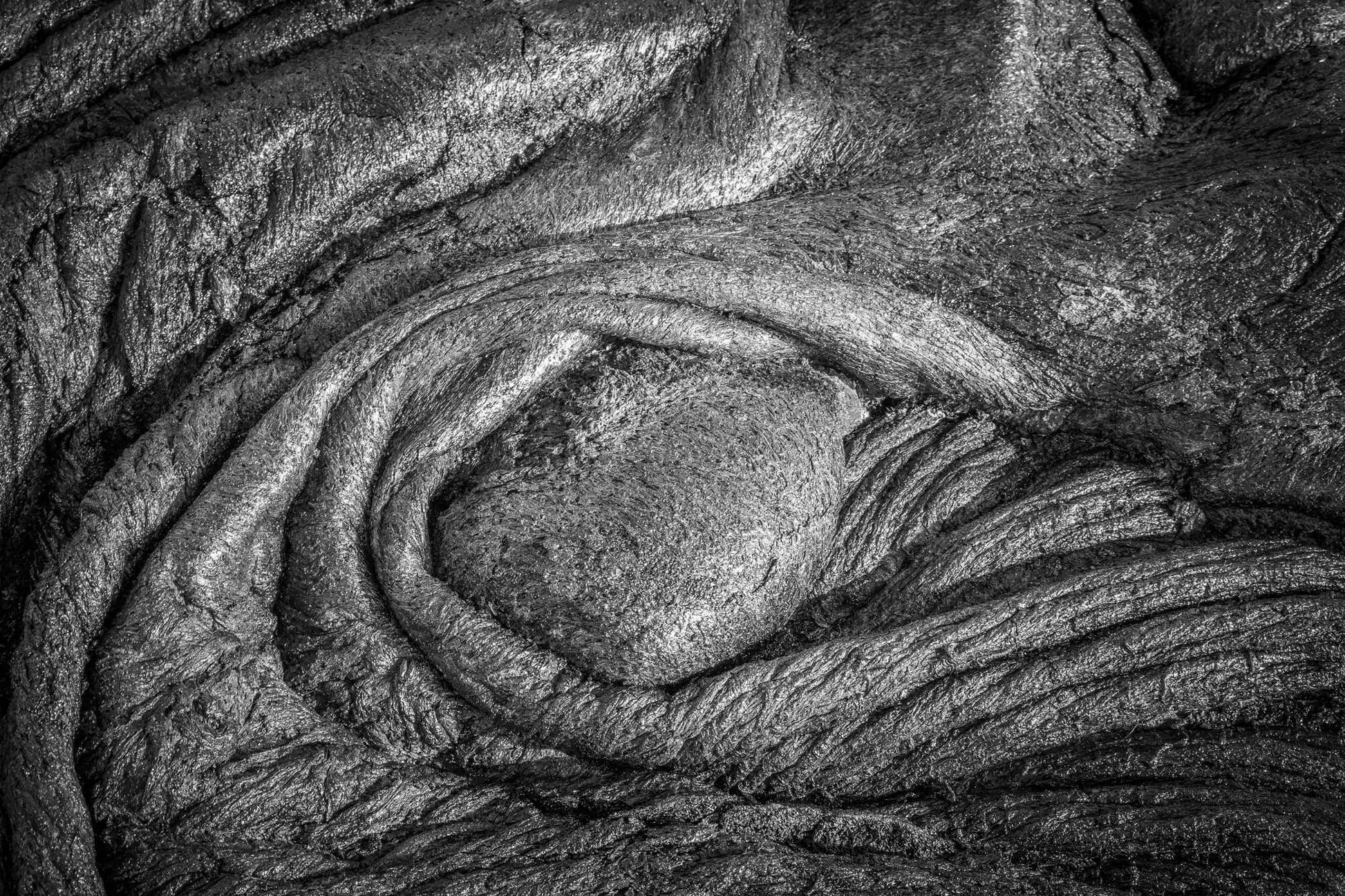 The lava has hardened, its flow creating a shape I describe as the "eye of madame Pelé, Hawaiian goddess of fire.