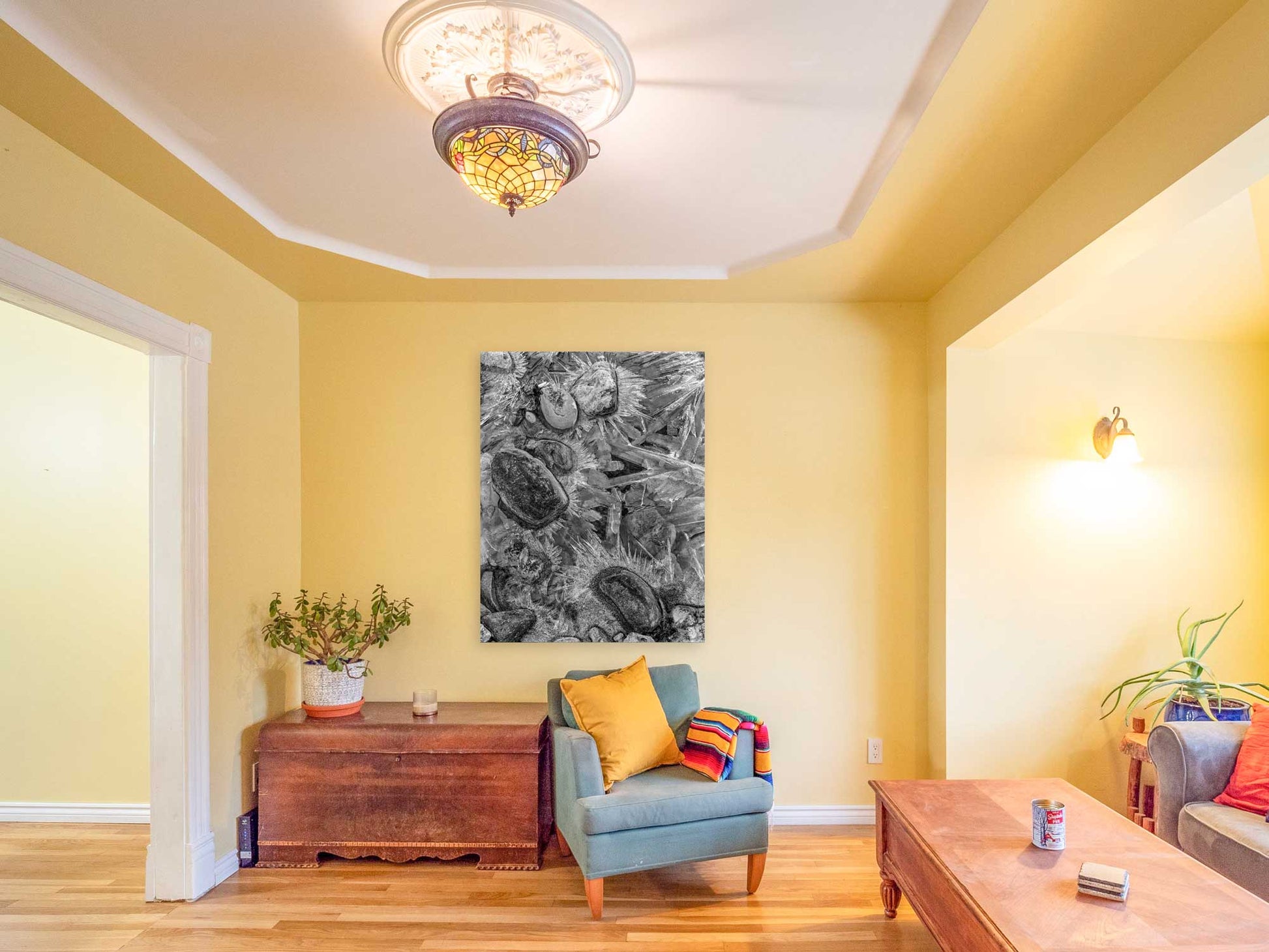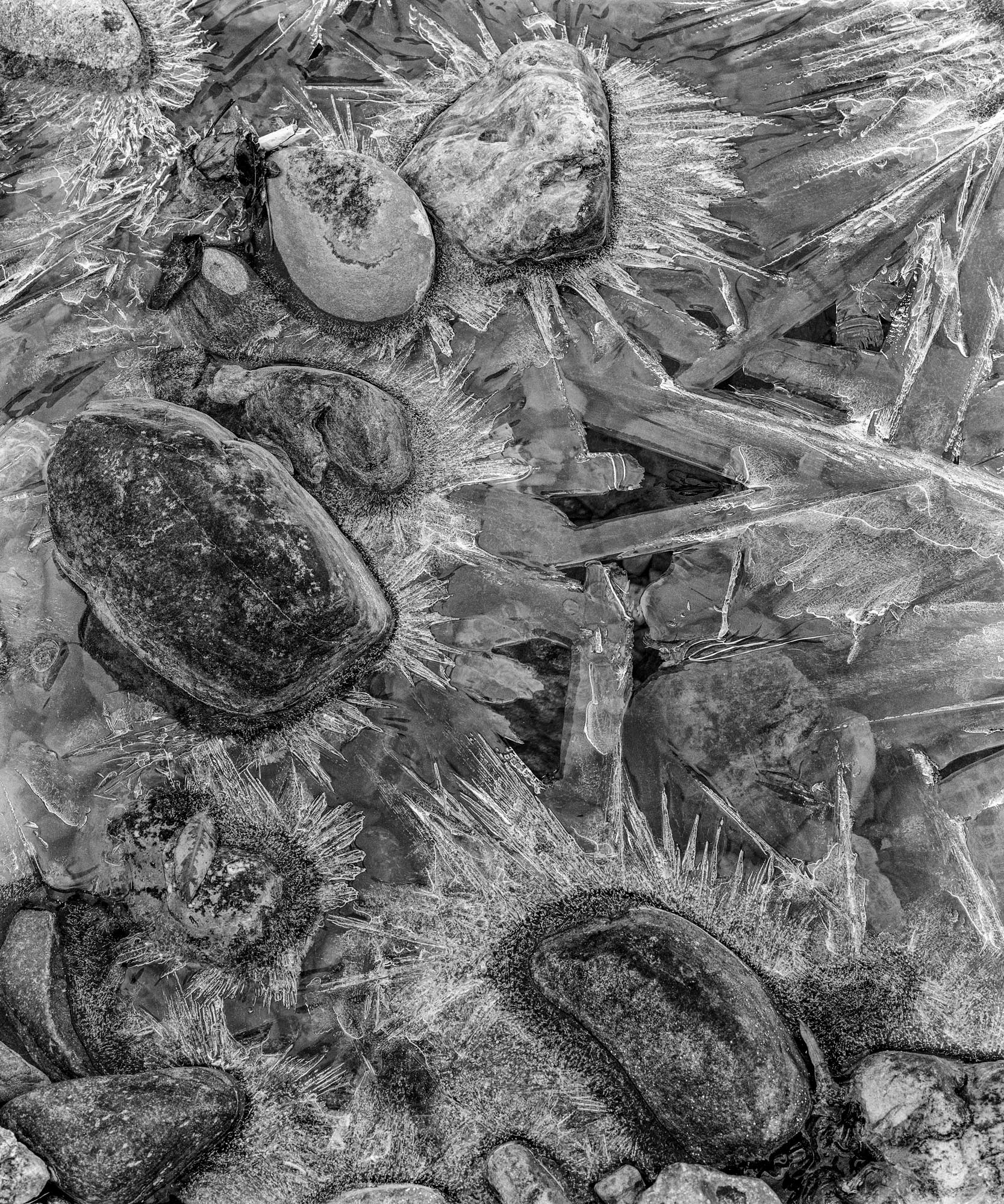 Ice crystals emanate from the rocks like petals, creating a lively abstraction along the Old Man River.