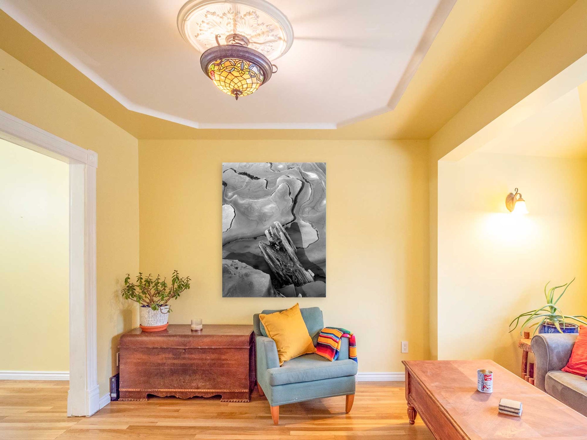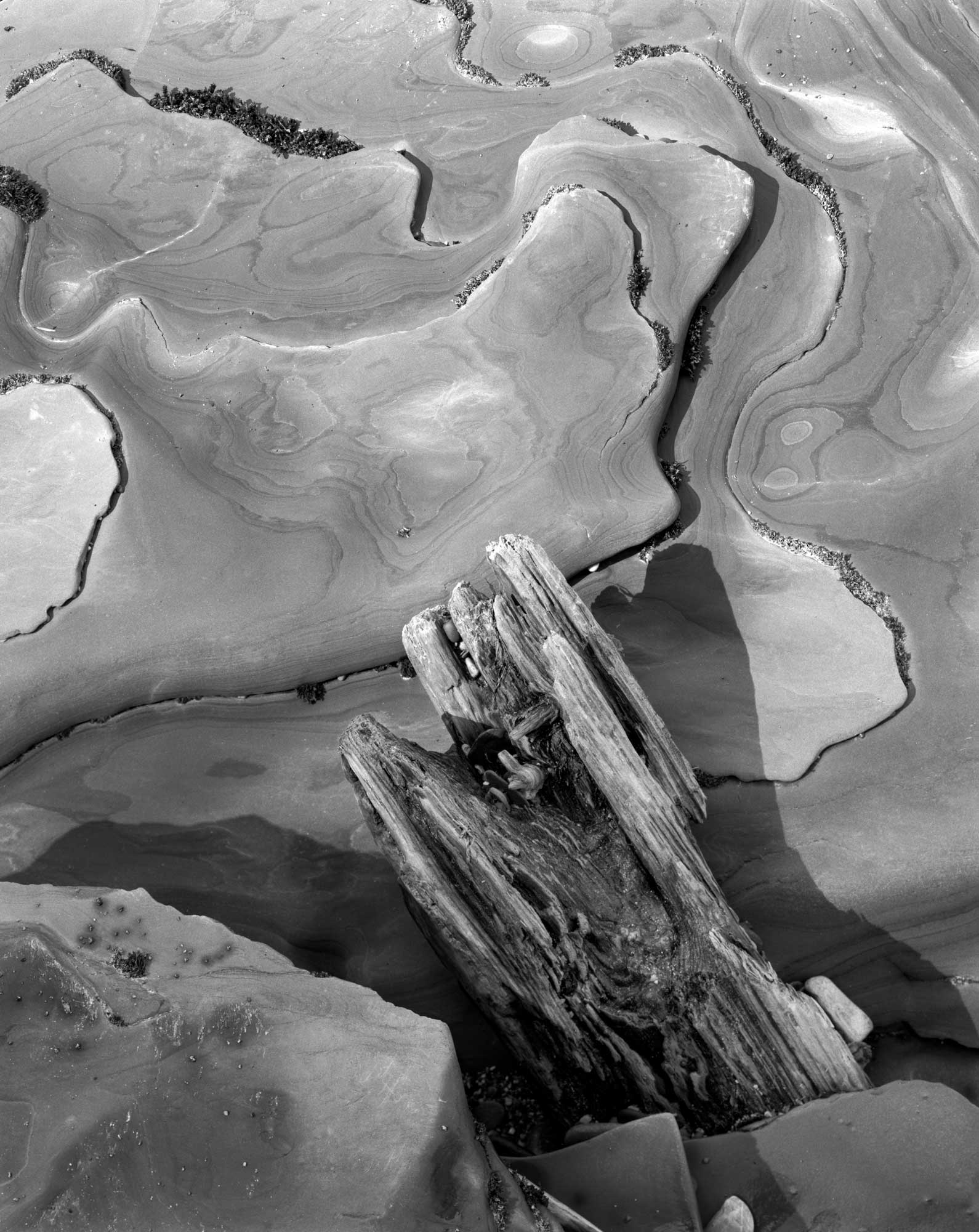 The limestone has been heavily sculpted by the fast-flowing water. This wedged driftwood provides a visual counter point to the abstract striations of the limestone behind it.