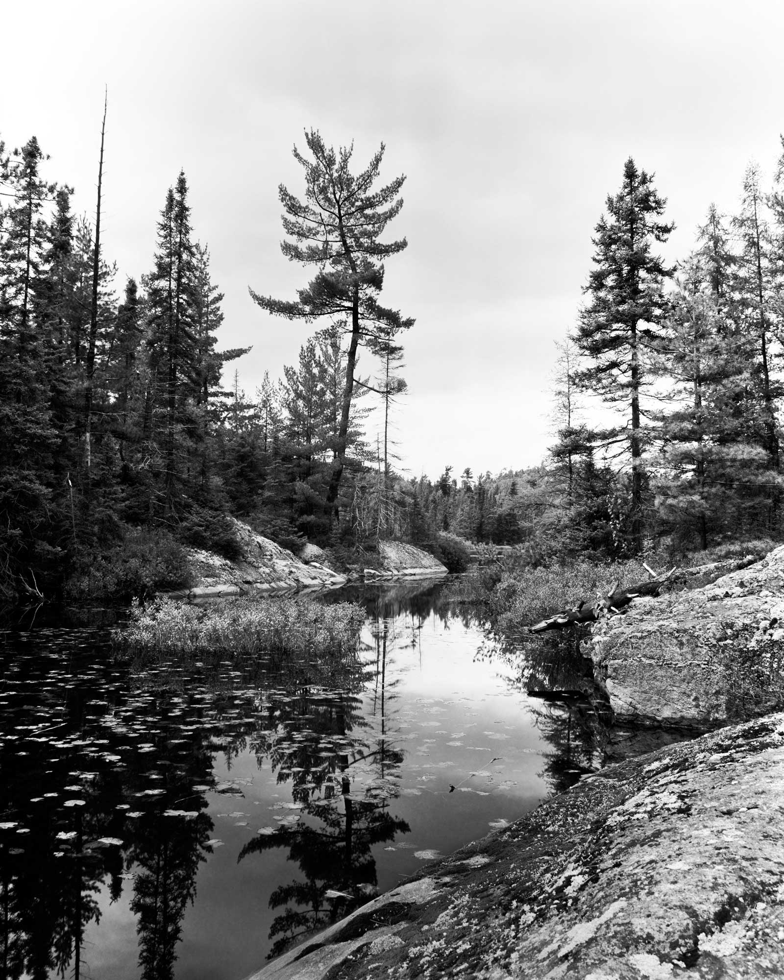 A red and white pine forest reflects perfectly in the still water along Wilson Lake road south of Temagami.