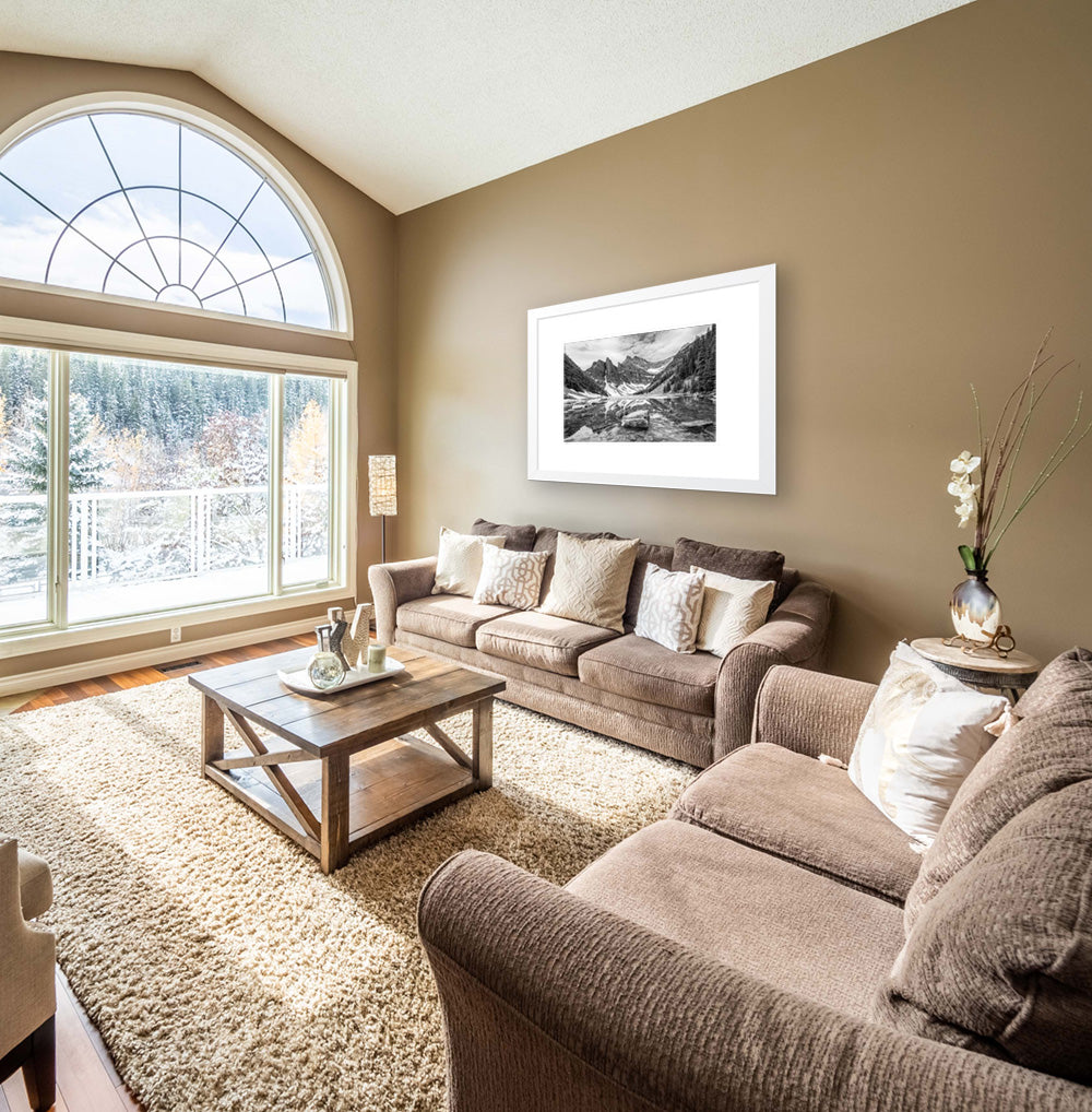 Framed prints are available in three sizes (12"x 16", 18"x 24", and 24" x 32") print size. Both sizes are printed on 100% rag fine art papers and are framed to museum standards and presented with a 4.5 inch window matte on all sides using 100% cotton rag board and acid free backing.