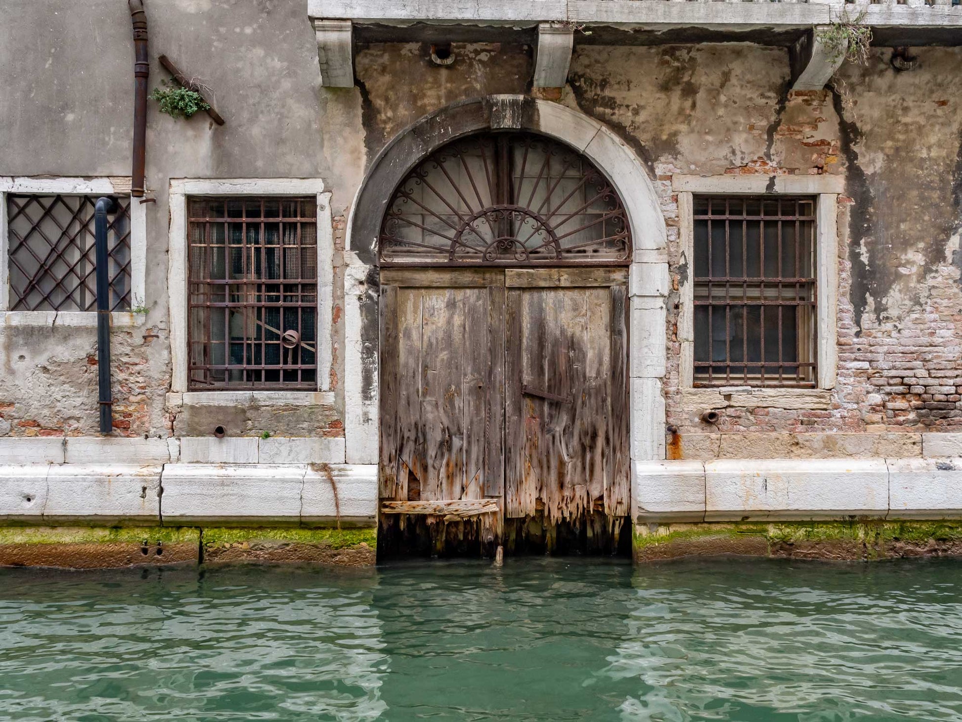I was curious if you could navigate a boat right into this building. The rise and fall of the waterline is evidenced by the algal growth on the stone work as well as the rot on the bottom of the door.
